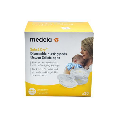 Medela Safe & Dry™ Disposable nursing pads are available in packs of 30 or 60 individually wrapped breast pads.